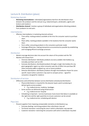 These notes cover all topics from all lectures including: Intro to marketing, the marketing environment and market analysis Market Research Consumer Behaviour Markets: segmentation, targeting and positioning Product Price Promotion Distribution (place) Services, social and not-for profit marketing Digital and international marketing Data Analytics and Business buying behaviour