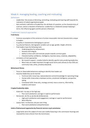 These notes cover all topics from all lectures including: Introduction to managing and organisations Managing individuals Managing teams and groups Managing leading, coaching, and motivating Managing human resources Managing cultures Managing conflict, power, politics, and decision-making in organisations Managing communications Managing knowledge, innovation, and change Managing social responsibility ethically Managing organisational design Managing globalisation