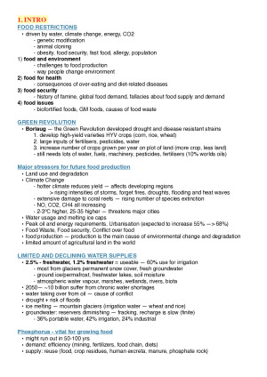 Chronological notes for the entire semester and includes all 4 forums held (guest speakers) - List of all lecture topics covered: W1: Intro and Environment, Feeding a hungry planet W2: Major trends, impacts of climate change W3: Basic nutrition and micronutrients W4: Evolution and Human Diet, Obesity W5: Forums 1 and 2 W6: Population, climate and food, feeding the world W7: Forum 3, Agriculture in Australia and Economist's view of notions about resource use and food supply W8: Famines, food security W9: GM foods, Food issues W10: Sustainable cities and food waste W11: Mediterranean Diet/French Diet/AGHE, Pandemic and food security W12: Forum 4 - Forum topics covered: > Indigenous foods, Sports nutrition, Sustainable foods/climate change, Mindfulness