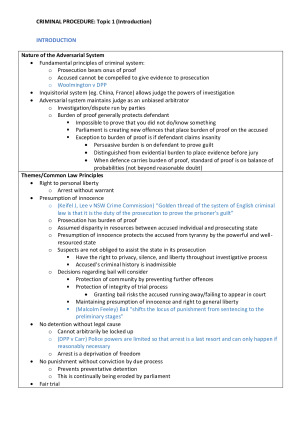 - 80 pages - Notes from readings ("Criminal Laws" 7th Ed by Brown et al.; "Civil Procedure in NSW" 4th ed by Kumar et al. (KLVM)) - Notes from lectures + supplementary information covered in tutorials - Includes notes on cases (facts + judgment + principles) - Criminal topics covered: Introduction to Criminal Procedure; Police Powers and Discretion; Bail and Appeals; Pre-Trial Process, Decision to Prosecute and Mandatory Defence Disclosure; Sentencing and Punishment - Civil topics covered: Process, Open Justice and Fairness, Adversarial System of Justice, Case Management, ADR, Costs and Ethics; Matters Preceding Litigation and Commencing Proceedings; Pleadings and Particulars, Gathering Evidence; Opposing Disclosure, Privilege; Trial or No Trial
