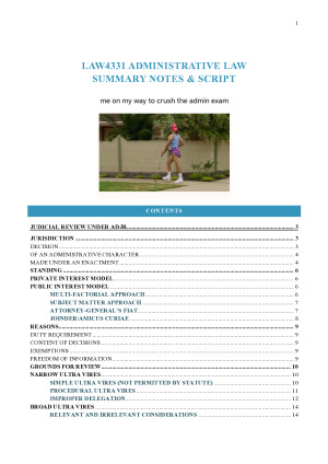 Detailed and comprehensive notes for Administrative Law. All topics are covered, including merits review and judicial review under both the ADJR Act and the common law. These notes provide an in-depth overview of the course and are structured to be perfect for exams. References to cases and legislation are colour-coded for ease of reference, red flags to look for in problem questions are highlighted, and a suggested script is included.