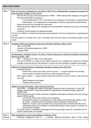 Case Studies which are crucial for the Human Resource Management Final Exam (Scored Distinction!!) Topics covered: - HRM Models and Theories (Part 1 and 2) - Employee Engagement - Diversity & Inclusion// Wellbeing - Legal Context of HRM - HR Planning - Work Design - Talent Attraction & Selection - Performance Management - Retention & Development - Strategic Rewards Management