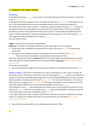 This is the complete set of notes used to obtain a high HD in the Torts Exam at the end of Semester 2 2018. These notes are compiled from lecture content, tutorial content, LSS tutorials and prescribed textbook readings. They are comprehensive yet in an easy to follow format that can be applied well in an exam setting. Topics covered: - Trespass to the person (+ defences) - Trespass to Land (+ defences) - Private Nuisance - Negligence - Duty of Care - Pure Economic Loss - Pure Mental Harm - Breach of duty - Causation - Remoteness - Vicarious Liability Note: these are student notes and do not replace what is taught by course staff. When in doubt, follow the direction of lecturers and tutors.