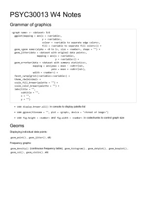 Hello there! I've seen a lot of people struggling with R studio, and I was very lucky to have enjoyed it. So I've decided to share my notes for the subject. They helped me to achieve a H1 (88 marks, 93 before scaling) so I really hope that they help you too! The PDF file includes: 1. Notes for the topics: - Week 1: Introduction to R - Week 2: Basics of R - Week 3: Data manipulation - Week 4: Graphs and plotting - Week 5: Statistical theory - Week 6: Chi-squared tests - Week 7: T-tests - Week 8: ANOVA - Week 9: Regression And extra resources: 2. Examples of graphs 3. Links to useful online resources (color chart, cheat sheets, rule of thumb for effect sizes etc.) I'm list the price as low as I can (the lowest price that can be listed is $29). Please refer this listing to your friend who you think need this help! Thank you and hope you have a wonderful semester! (Please try not to share the PDF file as they are copyrighted once listed on the platform, and keep in mind the hours and weeks of hard work that was put into the notes!!)