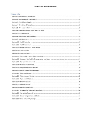 These notes are a summary of all lectures in Psychology 1A at UNSW. They allowed me to do very well in the exams, and were an excellent revision tool for the Final.