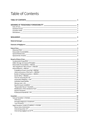 It includes topics: - Meaning of 'Reasonable Foreseeability' - Negligence - Pure Mental Harm - Defences of Negligence - Vicarious Liability - Breach of Statutory Duty - Damages It is very easy to follow and organized very well with elements for each argument. It includes a table of content. The sample is just snippets of how every topic is dealt with in the notes