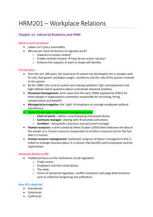 - Selling my detailed, thorough and comprehensive notes for MGMT2040 (HRM201) in which I achieved a HD. - Headings are colour coded to break down information and topics. List of topics included: Week 1- Industrial Relations, HRM and Employment Relations/ Chapter 11 Week 2- Approaches to the study of Employment Relations/ Chapter 1 Week 3- Employment relations in the Australian context/ Chapter 2 Week 4- Trade unions and employer associations/ Chapter 3&4 Week 5- The state (1) / Chapter 5 Week 6- The states (2)/ Chapter 5 Week 7 - Agreement and rule making (1) / Chapter 6 Week 8 - Agreement and rule making (2)/ Chapter 6 Week 9 - Reading week (no lecture or readings) Week 10 - Wage determination / Chapter 7 Week 11- Industrial conflict / Chapter 8 Week 12- WHS / Chapter 10 Please note the notes are titled "HRM201" as I completed the unit before they changed the unit code to MGMT2040