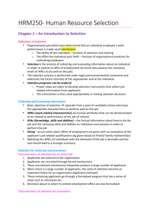 - Selling my detailed, thorough and comprehensive notes for MGMT2050 (HRM250) in which I achieved a Distinction. - Headings are colour coded to break down information and topics. - Notes include all lecture topics and assigned textbook chapter readings Listed below are the chapters in order of assigned topic weeks following the order of my notes: Chapter 1- An introduction to Selection Chapter 6 - Human resource measurement in selection Chapter 7 - Reliability Chapter 8 - Validity Chapter 3- Job analysis Chapter 8- Recruitment Chapter 9- Application forms and biodata assessments, training and experience evaluations and reference checks Chapter 15- Strategies for selection decision making Chapter 11- Ability tests Chapter 12- Personality assessments Chapter 14- Testing for counterproductive work behaviours Chapter 12- Simulation tests/ performance tests Chapter 9 - The selection interview Please note I completed this unit when it was named HRM250 before the unit code changed to MGMT2050.