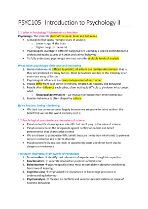 - Selling my detailed, thorough and comprehensive notes for PSYU1105 - Headings are colour coded to break down information and topics. Notes include all weekly topics and lecture readings: Week 1- Developmental Psychology (Chapter 10) Week 2- Developmental Psychology (Chapter 10) Week 3- Developmental and Health Psychology (Chapter 12) Week 4- Health Psychology (Chapter 12) Week 5- Social Psychology (Chapter 12) Week 6- Social Psychology (Chapter 13) Week 7- Organisational Psychology (Includes external required reading summary) Week 8- Organisational Psychology (Includes external required reading summary) Week 9 - Perception (Chapter 4) Week 10 - Perception (Chapter 4) Week 11- Cognition (Chapter 7) Week 12- Cognition (Chapter 7) Statistics Component, all topics included in notes: Week 1: Intro to statistics Week 2: Why statistics? Week 3: Intro to stata + data input Week 4: Summarising data Week 5: Fundamental concepts Week 6: T- tests 1 Week 7: T- tests 2 Week 9: Correlations Week 10: Chi square tests Week 12: Communicating statistics Please note, I completed this unit when the unit code was PSYC105 before it was changed to PSYU1105 earlier this year. The content and unit is still the same, the unit code has just been changed.