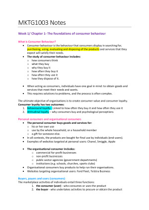 - Selling my detailed, thorough and comprehensive notes for MKTG1003 in which I achieved a HD. - Includes a variety of diagrams, mind maps and tables which help you to understand the content better! - Headings are colour coded to break down information and topics. Notes include the following topics and readings: Week 1- Introduction to Consumer Behaviour (Chapter 1) Week 2- Mindful Consumption Week 3- Market Segmentation (Chapter 2) Week 4- Consumers as individuals: needs and motivations (Chapter 3) Week 5- Consumers as individuals: personality and self concept (Chapter 4) Week 6- Consumers as individuals: perception (Chapter 5) Week 7: Consumers as social beings: digital marketing Week 8: Consumers as individuals: attitudes (Chapter 7) Week 9: Consumers as social beings: social influences (Chapter 8) Week 10: Consumers as social beings: culture and cross cultural influence (Chapter 10 and 11) Week 11: Consumers as individuals: learning and involvement (Chapter 6) Week 12: Decision Making (Chapter 14)