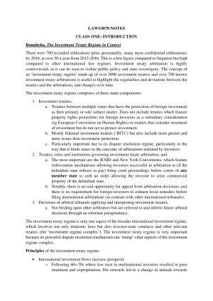 Notes covering the ENTIRE LAWS3070 course including: Introduction to international investment law History of international investment law Definitions of 'investor' Definitions of 'investment' Umbrella clauses Expropriation Fair and equitable treatment Exceptions to treaty protections National treatment Most-favoured-nation treatment Investment treaty arbitration Received a High Distinction with a final mark of 87 for this course.
