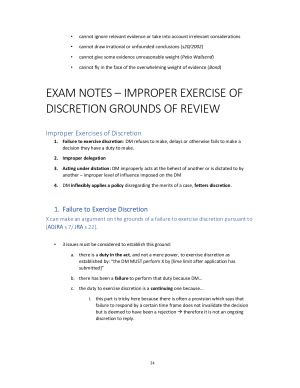Exam skeleton prepared to answer merits review and judicial review hypothetical questions covering content: 1. Access to information 2. Merits review 3. Access to judicial review 4. Standing 5. Grounds of review - procedural fairness - ultra vireos - improper purpose - (ir)relevant considerations - unreasonableness - irrationality - improper exercise of discretion I obtained 56/60 for the final exam with these notes.