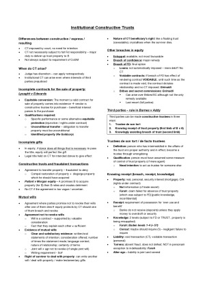 Most brief summary of what you need for LAWS2015 Equity final exam - with key principles, tests, ratios from case law and highlights from lecturers. Please refer to the Sample of the notes and see how it is formatted. I have made these notes just to help me with writing exam answers. Topics covered are: - Fiduciary obligations - Specific performance - Injunctions - Damages under Lord Cairns Act - Estoppel - Introduction to trusts - Creation of express trusts - Trustees - Beneficiaries - Resulting trusts - Institutional constructive trusts - Remedial constructive trusts - Tracing These are essentially the summary version of my LAWS2015 EQUITY COMPREHENSIVE FINAL EXAM NOTES that are also listed for purchase.