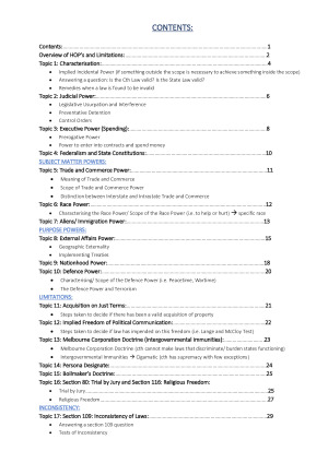 Exam topics covered: - Overview of HOP’s and Limitations - Topic 1: Characterisation - Topic 2: Judicial Power - Topic 3: Executive Power (Spending) - Topic 4: Federalism and State Constitutions - Topic 5: Trade and Commerce Power - Topic 6: Race Power - Topic 7: Aliens/ Immigration Power - Topic 8: External Affairs Power - Topic 9: Nationhood Power - Topic 10: Defence Power - Topic 11: Acquisition on Just Terms - Topic 12: Implied Freedom of Political Communication - Topic 13: Melbourne Corporation Doctrine (intergovernmental immunities) - Topic 14: Persona Designate - Topic 15: Boilmaker’s Doctrine - Topic 16: Section 80: Trial by Jury and Section 116: Religious Freedom - Topic 17: Section 109: Inconsistency of Laws