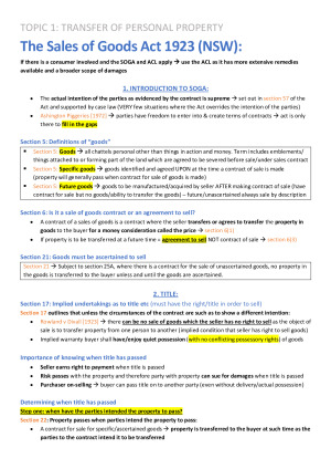 All topics covered - The Sales of Goods Act 1923 (NSW) - Australian Consumer Law (NSW) - Bailment & Financing - Personal Property Security Act 2009 (‘PPSA’) - Conflict of Laws - International Sale of Goods