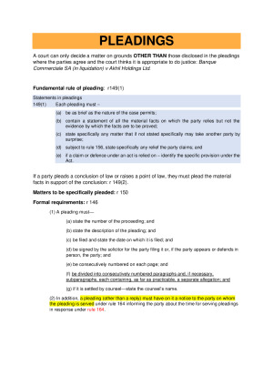 Outlines notes summarised for the entire semester, excluding the Notice of Intention to defend material as this was in the 2020 Sem 2 assignment and material on the Federal Court in week 12. Topics covered include: 1. Jurisdiction + cross-vesting 2. Time limitations and joinder 3. service 4. drafting 5. some disclosure 6. court applications: affidavits, subpoenas 7. disposition without trial 8. appeals 9. enforcement 10. costs
