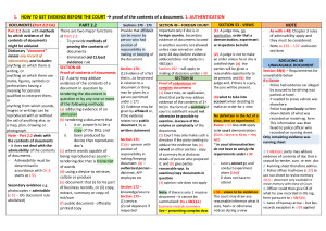 Entire Evidence Course summarised into shorter tables. Based on readings and all lectures. Topics Covered: DOCUMENTS PRESENTING COMPLEX DOCS EXHIBITS AND VIEWS EXPERIMENTS WITNESS COMPETENCE AND COMPELLABILITY CHILD WITNESSES QUESTIONING A WITNESS EXAMINATION IN CHIEF UNFAVOURABLE WITNESSES CROSS EXAMINATION RE-EXAMINATION CALLING WITNESSES – RIGHT TO SILENCE FAILURE TO CALL A WITNESS JONES V DUNKEL RELEVANCE HEARSAY CREDIBILITY EVIDENCE EVIDENCE FOR A NON-HEARSAY PURPOSE RULE ADMISSIONS CHARACTER EVIDENCE OPINION EVIDENCE TENDENCY AND COINCIDENCE EVIDENCE RECENT AMENDMENTS DISCRETIONARY MANDATORY RULES EXCLUSIONS AND WARNINGS WARNINGS AND DIRECTIONS PRIVILEGE