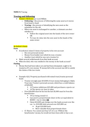 This comprehensive and up-to-date set of notes provides a detailed framework and guide to the Equity course. 1. The History and Nature of Equity 2. Applications of the Conscience of Equity (Breach of Confidence and Estoppel) 3. Remedial Equity 4. The Nature and Constitution of Trusts 5. Operation of Express Trusts 6. Fiduciary Obligations 7. Resulting Trusts 8. Constructive Trusts 9. Tracing 10. Charity