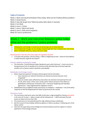 Table of Contents Week 2: Work and Industrial Relations Policy today: What are the Problems/Policy problems Week 3: Governments Week 4: How did we get here? What has policy been about in Australia Week 5: Fair Work Week 6: Issue 1: Unions Week 7: Issue 2: Work and Family Week 8: Issue 3: Skills and Immigration Week 10: Issue 4: productivity