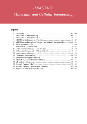 These notes cover all 17 lectures covered in the IMMU3102: Molecular and Cellular Immunology course. These HD-level notes provide a comprehensive, yet concise summary on the subject content covered, plus further relevant information that I found helped me understand the content (doesn't include any unnecessary detail) - Organised by lecture and topic - Page numbers on title page ordered according to topic helps with easy nagivation of the document - Contains figures and diagrams to help with understanding the content