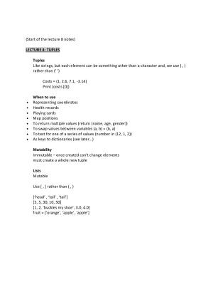 These notes cover the full subject of COMP10001: Foundations of Computing for 2020 Semester 1. The content of these notes was sourced from lectures, guest lectures, tutorials, assignments and Grok. These notes include: - All content from lectures, tutorials and Grok worksheets - All concepts include clear examples in Python syntax They are suitable for beginners with no experience coding and to those who just want a summary of the entire course. I had no prior experience coding before this subject and these helped me to achieve a H1. The Topics Covered: • Basics • Strings • Format • Functions • Loops • Tuples • Dictionaries • Mutability • Modules and Files • Testing and Debugging • Debugging, Exceptions, Assertion • Iterators and itertools • Recursion • URL’s and HTML • HTML and Web Programming • Algorithms • Images • Data Structures Guest Lectures: • Cryptographic Protocols • Higgs Boson Discovery