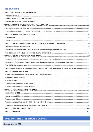 These HD private investment law notes are concise, clear and comprehensive. They are set out in a manner that allows you to readily respond to any exam problem question. These notes cover all examinable topics, namely: - introductory principles to venture capital; - raising venture capital in Australia; - partnerships and trusts; - tax incentives for early-stage innovation companies; - equity investment programs; - superannuation; - employee share schemes; - R&D tax incentives; and - grants.