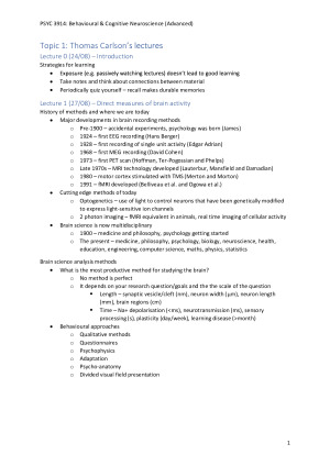 I made these notes using all lecture material, and readings from the course. Studying with my extensive notes will enable you to get a mark like mine or higher!! These notes are extremely detailed and provide you with all the information you need for the final exam and tutorial quizzes. Note: the lecture content and final exams for PSYC3014 and PSYC3914 are identical so these notes would be perfect for students completing either stream of Behavioural & Cognitive Neuroscience. Lecture topics included in these notes: Topic 1: Thomas Carlson’s lectures Lecture 0 – Introduction Lecture 1 – Direct measures of brain activity Lecture 2 – Indirect measures of brain activity Lecture 3 – Information processing Lecture 4 – Maps & modules Lecture 5 – Brain rhythms Lecture 6 – Sleep Topic 2: Irina Harris’s lectures Lecture 7 – Visual processing of objects I: Cortical organisation Lecture 8 - Visual processing of objects II: Object representations & neuropsychological disorders Lecture 9 – Episodic memory I Lecture 10 – Episodic memory II Lecture 11 – Semantic memory Lecture 12 – Language & aphasia I Lecture 13 – Language & aphasia II Lecture 14 – Dementia syndromes Topic 3: Alex Holcombe’s lectures Lecture 15 – Modelling, brains and computers I Lecture 16 – Modelling, brains and computers II Lecture 17 – Representing space I Lecture 18 – Representing space II Topic 4: Justin Harris’s lectures Lecture 19 – Neurobiology of memory and learning I Lecture 20 – Neurobiology of memory and learning II Lecture 21 – Movement & action I Lecture 22 – Movement & action II: The basal ganglia Lecture 23 – Cellular changes in neurodegenerative diseases