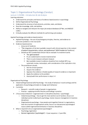 I made these notes using all lecture material, and readings from the course. Studying with my extensive notes will enable you to get a mark like mine or higher!! These notes are extremely detailed and provide you with all the information you need for the final exam and case study assignments. The notes will also be useful when creating your tutorial presentation and choosing an appropriate topic. Lecture topics included in these notes: Topic 1: Organisational Psychology (Carolyn) Lecture 1 – Introduction & Job Analysis Lecture 2 – History and theory of organisational psychology Lecture 3 – Job performance and job selection Lecture 4 – Motivation Lecture 5 – Training Lecture 6 – Teams & leadership Topic 2: Forensic Psychology (Celine) Lecture 1 – Introduction to forensic psychology Lecture 2 – Criminal offenders: Sentencing and risk assessment Lecture 3 – Juries & expert witnesses Lecture 4 – Eyewitness memory Lecture 5 – Children in the legal system Lecture 6 – Detection of deception Lecture 7 – Police psychology Lecture 8 – Victims of crime Topic 3: Health Psychology Part I (Harianna) Lecture 1 – Where social, legal and health psychology collide Lecture 2 – Introduction to health psychology: Models of health behaviour Lecture 3 – Healthcare disparities and adjustment to illness Lecture 4 – Health risk and health enhancing behaviours Lecture 5 – Interventions: Individual and public health Topic 4: Health Psychology Part II (Ilona) Lecture 1 – Medical communication Lecture 2 – Medical decision making Lecture 3 – Psychosexual adjustment after illness Lecture 4 – End of life issues & palliative care Lecture 5 – Cancer survivorship