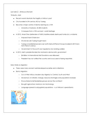 Complete set of notes used for African Geography week 11 test: Lecture 1 - Physical Geography Lecture 2 - African History Lecture 3 - Nationalism & Independence Lecture 4 - Modern Africa - Political Economy Lecture 5 - Environment & Development Lecture 6 - Agrarian Transformation, Rural Livelihoods, Land Grabs Lecture 7 - Development Aid Lecture 8 - Urban Development Lecture 9 - Mineral Wealth and Conflict in DRC Lecture 10 - Gender, Feminism & Development in Africa