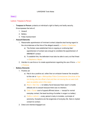 - Lecture notes inclusive of weeks 1 - 12. - Topics covered include An Introduction to Tort Law and Theory, Litigating a Claim, Trespass to Person, Trespass to Goods, Trespass to Land, Nuisance, Defences to Intentional Torts, Duty of Care Principles, Categories of Harm, Special Parties, Standard of Care and Breach of Duty, Damage, Remoteness and Causation, Concurrent Liability and Defences to Negligence. - Notes also include explanations of key concepts including categorisation of damages, apportionment legislation and the Ipp Report. - Notes are categorised according to the topics studied per week. - A large portion of the Information is separated into tables. The elements for all tortious offences are clearly outlined in the tables with case law supporting how those elements are applied in different circumstances. - The elements for defences to torts also appear in tables with their relevant elements clearly outlined. - Notes are also colour coded. Common law cases appear in orange, examples appear in blue and important considerations appear in pink. - Relevant legislation is also quoted within and explained. - These notes are concise yet thorough and include everything needed to prepare for exam hypotheticals and assessments.