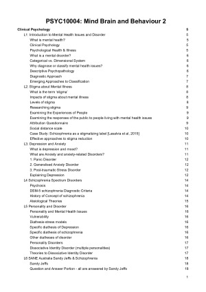 - Notes on all examinable lectures and assigned readings from each module - Topics include: Clinical Psychology, Developmental Psychology, Social Psychology and Personality Psychology and Research Methods - Notes are organised by lectures, extra information and synthesis from different resources or from Question and Answer livestreams - Synthesises and explains case studies of previous psychology studies where relevant in the topic - Notes act as a supplementary to provide an overview of what to know for the exam and support understanding through simplification and explanation