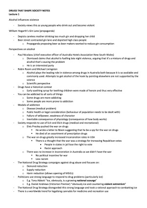 Drugs that Shape Society comprehensive notes for all 23 lectures. Helped me score a H1 for quizzes, the major assignment and the final exam. Includes notes on Alcohol/ Prohibition, Tobacco, Addiction, Marijuana, Opiates, Drug Markets, Drugs & Social Panics, Supervised Injection, Vaccination, Drugs in Sport, Contraception, Antibiotics/Penicillin, Thalidomide, Drug Discovery and Approval