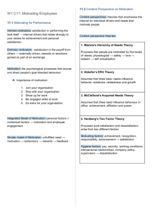 These notes are VERY comprehensive, and are perfect for assessments. They use information from the textbook and lecture slides, as well as additional readings and research. They cover Week 1 to 10 topics, including: 1. Motivating Employees 2. Managing Individuals 3. Power, Leadership & Communication 4. Groups & Teams 5. Decision Making 6. Global & Ethical Managers 7. Human Resources Management 8. Strategy Since the course is content heavy, all the notes are structured under their own respective category and section to make revision easy!