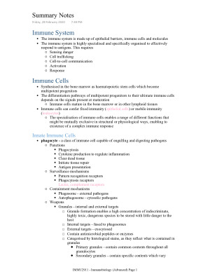 HD (92) Summary Notes for Immunobiology (Advanced) - completed Semester 1 2020 - all lectures - relevant for IMMU2011, IMMU2911 - organised by topics, including: > Immune Cells > Immune Molecules > Lymphoid Tissues and the Lymphatic System > Innate Immune System > Adaptive Immune System > Complement System > Vaccinations > Microbes, Pathogens and Antigens > Evolution of the Immune System > Plant Immunology > Animal Immunology