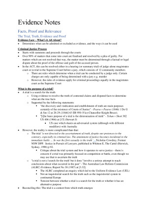 Detailed notes of the entire course NOT an exam summary. Includes: Introduction - Facts, Proof and Relevance Adducing Evidence Privileges Hearsay Admissions Opinion Evidence Tendency & Coincidence Character & Credibility Identification, Discretions & Warnings