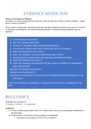 These are the best notes I have ever created for a subject (if I do say so myself). I spent a lot of time compiling these notes so I was able to take the exam with ease. Evidence is an easy subject once you have wrapped your head around the topics - so use these notes either on their own or in conjunction with you own. I hope they help you out as much as they helped me! PS: I have also included my flowchart which was a lifesaver during the exam! (this is at the bottom of the notes PDF) The topics included are: 1. IS THE EVIDENCE RELEVANT? 2. ARE THEY JUDICIAL MATTERS? 3. DO ANY OF THE REBUTTABLE PRESUMPTIONS APPLY? 4. IS A WITNESS COMPELLABLE AND COMPETENT TO GIVE EVIDENCE? 5. DOES THE CREDIBILITY RULE APPLY? 6. DOES THE TENDENCY RULE OR COINCIDENCE RULE APPLY? 7. RESTRICTIONS ON ADMISSIONS AND PREVIOUS REPRESENTATIONS? 8. DOES THE OPINION RULE APPLY? 9. DOES THE EVIDENCE CONTRAVENE THE RULE ABOUT EVIDENCE OF JUDGMENTS AND CONVICTIONS? 10. DOES THE HEARSAY RULE APPLY? 11. DOES A PRIVILEGE APPLY? 12. SHOULD A DISCRETION TO EXCLUDE THE EVIDENCE BE EXERCISED OR MUST IT BE EXCLUDED? IF THE EVIDENCE IS ADMISSIBLE ON THE ABOVE GROUNDS SHOULD THE COURT GIVE A WARNING TO THE JURY?