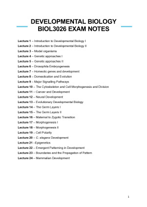 Highly detailed and thorough notes that cover every topic and lecture. They include illustrations that aid in explanation. Lectures include: Lecture 1 – Introduction to Developmental Biology I Lecture 2 – Introduction to Developmental Biology II Lecture 3 – Model organisms Lecture 4 – Genetic approaches I Lecture 5 – Genetic approaches II Lecture 6 – Drosophila Embryogenesis Lecture 7 – Homeotic genes and development Lecture 8 – Domestication and Evolution Lecture 9 – Major Signalling Pathways Lecture 10 – The Cytoskeleton and Cell Morphogenesis and Division Lecture 11 – Cancer and Development Lecture 12 – Neural Development Lecture 13 – Evolutionary Developmental Biology Lecture 14 – The Germ Layers I Lecture 15 – The Germ Layers II Lecture 16 – Maternal to Zygotic Transition Lecture 17 – Morphogenesis I Lecture 18 – Morphogenesis II Lecture 19 – Cell Polarity Lecture 20 – C. elegans Development Lecture 21 –Epigenetics Lecture 22 – Emergent Patterning in Development Lecture 23 – Boundaries and the Propagation of Pattern Lecture 24 – Mammalian Development