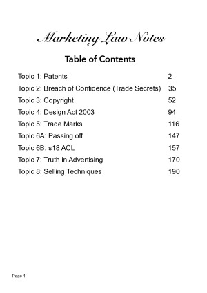 Topics 1. Patents 2. Breach of confidence 3. Copyright 4. Trade Marks 5. Designs 6. Passing Off & s18 7. Advertising 8. Selling Techniques These complete notes which contain all legislation and relevant cases were used in the exam and allowed me to score a HD (86). The notes are formatted through headings and sub headings that make the notes very easy to follow and understand. They cover all lectures, workshops and relevant textbook chapters from Marketing and the Law 5th edition. Within these notes are sample/model responses (including case analogies) which can be used effectively in the exam. I am studying a double degree in Law/Commerce so have been able to integrate the note-making skills from more difficult law subjects as part of this marketing unit, making these notes exemplary.