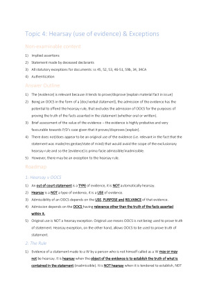 These notes are extremely comprehensive and with them, I was able to achieve a distinction in the final examination. They are clear, well-formatted and easy to follow and will provide you with a more in-depth understanding of the topic. These notes cover the following topics: 1A: Introductory Material 1B: Relevance 2: Examination in Chief 3: Cross Examination 4: Hearsay and Exceptions 5: Opinion and Exceptions 6: Propensity (XN) 7: The Shield (XXN) 8: Sex Offences, Identification and Corroboration