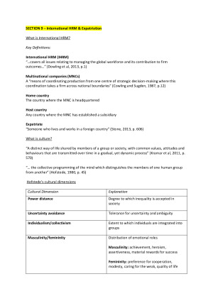 Comprehensive notes that cover all definitions and critical theories for group assignments as well as the exam. Theories are explained through examples and Section 11 is a subject summary that outlines key learnings of each week. The layout is easy to read and navigate, with each section and subsection clearly labelled. CONTENTS: 1. Introduction to HRM 2. Recruitment & Talent Acquisition 3. Performance Management Strategy 4. Reward & Remuneration 5. Job quality, engagement, and employee voice 6. Training & Development 7. Diversity in the Workforce 8. HRM & Ethics 9. International HRM & Expatriation 10. The HR profession and HRM performance 11. Subject Summary: Key Learnings of Each Week
