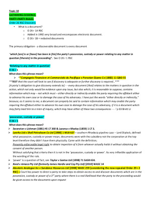 Very detailed notes for whole semester includes case citation and summary where required, topics: Forums for procedural hearings 2. Evidence in procedural hearings (Affidavits) 3. Gathering evidence Discovery & Inspection(party/party); Pre-action Discovery; Subpoenas; Interrogatories; Legal Professional Privilege; Public Interest Immunity 4. Specialised Procedures – see Part 9 CPDs Corporations Rules 2004; Injunctions; Search & Freezing orders; Probate jurisdiction 5. Judicial review and administrative proceedings Judicial Review (prerogative writs); Review Orders; State Administrative Tribunal; Committal & Attachment 6. Judgments, costs & enforcement Entry for trial, Orders & Judgments; Costs, Security for costs; Civil Judgments Enforcement Act 2004; 7. Appeals and Stated Cases Appellate hierarchy; Court of Appeal; Stated Cases