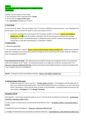 Very detailed, clearly sectioned and referenced including case summary in own words and combined with the text and lecture material all summarised perfectly for exams. Topics: TOPIC 1: INTRODUCTION TO TRUSTS TOPIC 2: CREATION OF EXPRESS TRUSTS [CH 21] TOPIC 3: THE VARIATION AND TERMINATION OF EXPRESS TRUSTS [CH 22]. TOPIC 4: CHARITABLE TRUSTS (PURPOSE TRUSTS) [CH 23] TOPIC 5 – RESULTING TRUSTS: [Ch 25] Topic 6: Constructive Trusts (ConT) [Ch 35] TOPIC 7: TRUSTEES: POWERS, DUTIES AND LIABILITIES [CH 26] TOPIC 8: B’S AND REMEDIES FOR A BREACH OF TRUST; [CH 27]