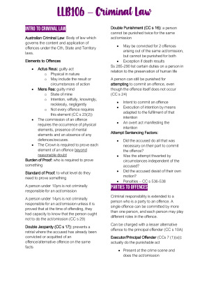 Topics Covered: Intro to Criminal Law, Criminal Responsibility, Parties to Offences, Non-Fatal Offences, Homicide, Sexual Offences, Defences and Excuses, Property Offences, Drug Offences Weeks Covered: 1-13 Extensive summary of all topics. Great for tutorial work or revision. Includes all necessary legislation and references.