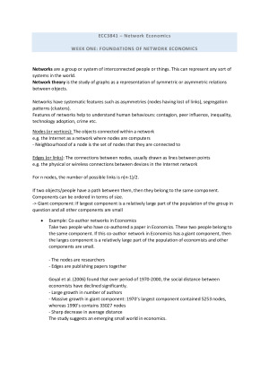 This was a new unit added under the Economics faculty at Monash. It was a high content and workload unit and I hope these notes will assist in your understanding of the unit. The material in these notes are from lecture notes, tutorial material and also from various sources online. Topics included: - Foundations of Network Economics - Network Formation - Peer Effects and Games on Networks - Physical Networks - Contagion and Diffusion - Crime in Networks - Role of Networks in Education - Homophily and Social Learning - Financial Networks - Development Economics and Networks - Industrial Organisation - Labor Markets