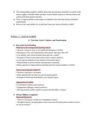 Has a summary of the topics each week and also summaries of the readings. Topics include: 1. Thinking Global Politics 2. The Centrality of the Environment to International Politics 3. Identity, race, religion, and gender 4. Formation of the state system 5. Political power and the state system 6. The UN and human rights 7. Economic power and the state system 8. Development, poverty, and inequality 9. Money and the GFC 11. Non state actors, violence, and peacekeeping 12. Media, power and resistance 13. Summary
