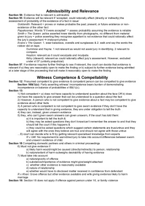 Received an 80 with these concise notes covering all relevant legislation and cases Covering: - Admissibility and Relevance - Witness Competence & Compellability - Documents & Relevance - Discretions & Warnings - Hearsay Evidence - Hearsay Exceptions - Admissions - Exclude Admissions - Opinion Evidence - Tendency and Coincidence - Character and Credibility - Identification, Discretions and Warnings