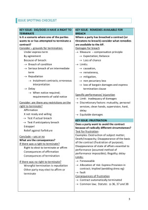 HD Exam Notes used for in- semester assessment and end of semester exam. Issue Spotting Checklist Topic 1 Termination (Termination for Breach, Termination for Repudiation, Termination for Delay, Consequences of Affirmation or Termination, Termination Cases) Topic 2. Remedies for Breach (Damages, Liquidated Damages and Penalties, Specific Performance, Injunctions, Restitution, Actions for Debt, Remedies for Breach Cases) Topic 3. Frustration (Frustration Cases) Topic 4. Common Law Vitiating Factors (Duress, Undue Influence, Unconscionable Dealings, Third Party Impropriety, Common Law, Vitiating Factors Cases) Topic 5. Remedies for Common Law Vitiating Factors (Remedies for Common Law Vitiating Factors Cases) Topic 6. Unconscionable Conduct Under Statute (Misleading or Deceptive Conduct, Unconscionable Conduct Under Statute Cases) Topci 7. Remedies for Unconscionable Conduct Under Statute and Misleading or Deceptive Conduct (Unconscionable Conduct Under Statute and Misleading or Deceptive Conduct Cases)