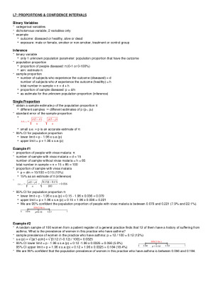 These notes (Part 2) comprise Lectures 7-11 while the remaining notes are available in Part 1 due to size constraint on this site. Notes are clearly organised and written in point forms. Each lecture note is 2-3 pages long yet contains all essential info from lecture slides + explanation stressed by lecturers + relevant diagrams. This set of notes is a great resource for the assignment and a life-saver during the final exam - which I managed to get 97% :) TOPIC LIST L7: Proportions & confidence intervals L8: Measures of association - comparison of proportion / odds L9: Controlling for confounding - stratification & regression L10: Design, sample size & statistical power L11: Measures of association (correlation coefficient, simple linear regression)