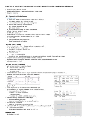 These notes (Part 3) comprise Chapters 12-17 while the remaining notes are available in Part 1 & 2 due to size constraint on this site. Notes are clearly organised and written in point forms. Each chapter is 2-5 pages long yet contains all essential info from the lecture notes + explanation stressed by lecturers + relevant diagrams. This set of notes is a great resource for the assessment/quizzes and a life-saver during the final exam - which I managed to get 88% :) TOPIC LIST C12: Inferences – numerical outcomes & 2 categorical explanatory variables C13: Inferences — numerical outcome & numerical explanatory variables C14: Inferences – binary outcome C15: Inferences – categorical outcome, simple methods C16: Study design & planning C17: Extension & modern methods