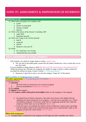 These IPCL notes cover the entire semester of content and consist of two parts: Part I: Full Course Notes (sample notes pages 1-3, not in order): these are full course notes complete with case summaries and with key principles in highlighted text boxes to make it easy to retain the most important information. Topics included: - Topic 1(a): the concept and function of property - Topic 1(b): introduction to real property - Topic 2: personal property - choses in possession - Topic 3: personal property - choses in action - Topic 4: assignment and disposition of interests - Topic 5(a): priority regimes - Topic 5(b): Commercial dealings as security interests over property Part II: Exam Summary/Scaffold notes (sample notes pages 4-7, not in order): these are condescend notes in a scaffold form which you can take into the exam to ensure you answer all relevant parts of the problem question and can easily identify the main tests/principles and apply them. Topics included: - Transfer of ownership by sale - Transfer of possession by bailment - Choses in action - Assignment and disposition of interests - General law priority rules - Security interests over property under the PPSA I attended all lectures, tutorials and did all readings and also relied on my own research and other notes in order to create these notes.